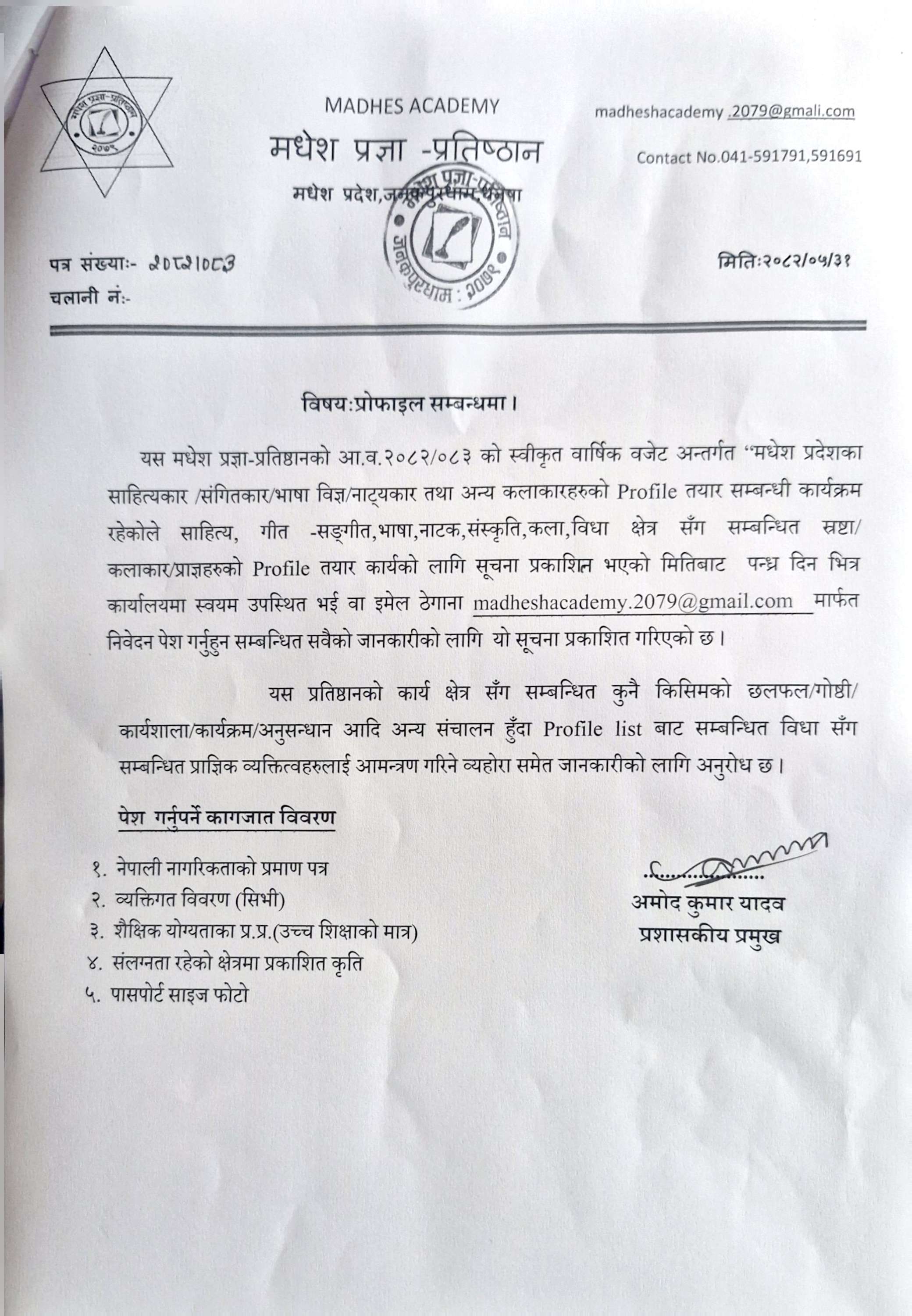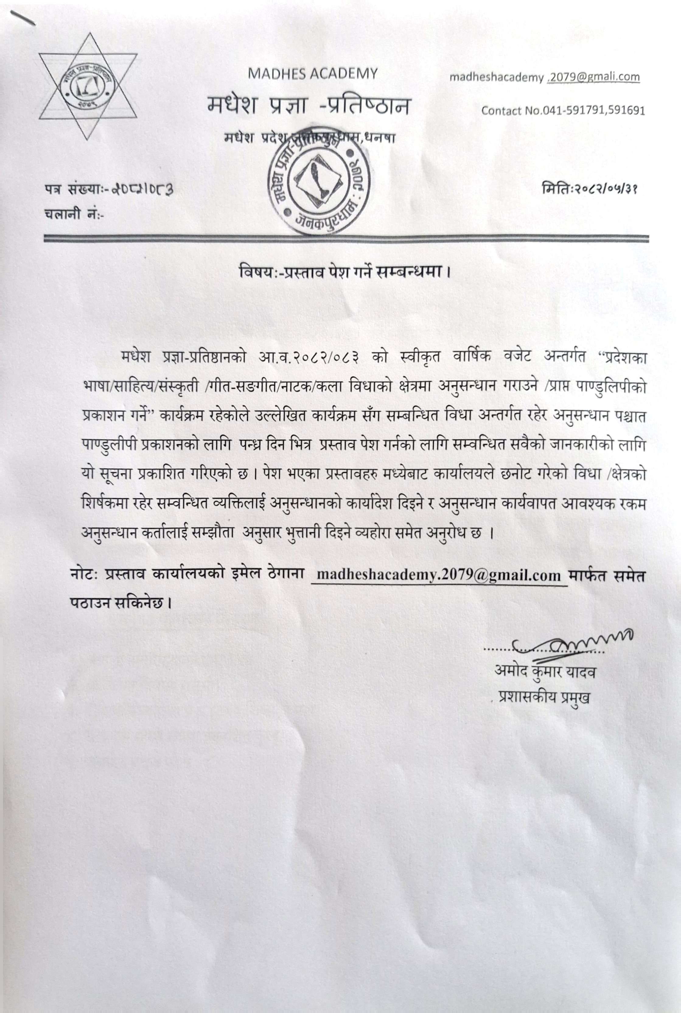 मधेश सरकार पनि यसै सोचलाई दृढतापूर्वक ग्रहण गरी मधेश प्रदेशका सबै भाषा, साहित्य, संस्कृति, ललितकला, नाट्यकला, सङ्गीत आदिको अध्ययन, अनुसन्धान गरी संरक्षण, संवर्द्धन र विकास गर्न यस मधेश प्रज्ञा-प्रतिष्ठानको गठन गरेको हो । यो प्रतिष्ठानले मधेशको भूगोल र पहिचानलाई अनुसन्धानमूलक कृतिको माध्यमले मजबुतीका साथ प्रदेश, राष्ट्र र अन्तर्राष्टिय जगतसम्म पुर्याउने आफ्नो लक्ष्य राखेको छ । यसको लागि प्रदेश सरकार, बौद्धिक जमात र अध्यनशील समाजको पूर्ण सहयोग र समर्थन को आवश्यकता रहिरहने छ ।